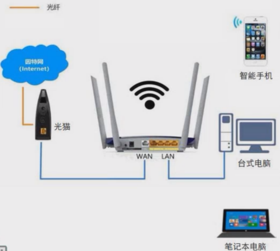 某家庭向运营商申请了光纤接入因特网服务,光猫由运营商提供。该同学购置了无线路由器,家中的台式电脑通过有线方式连接无线路由器,智能手机和笔记本电脑通过无线方式连接路由器,实现接入因特网。该家庭网络结构图如图所示,结合图示回答下列问题。